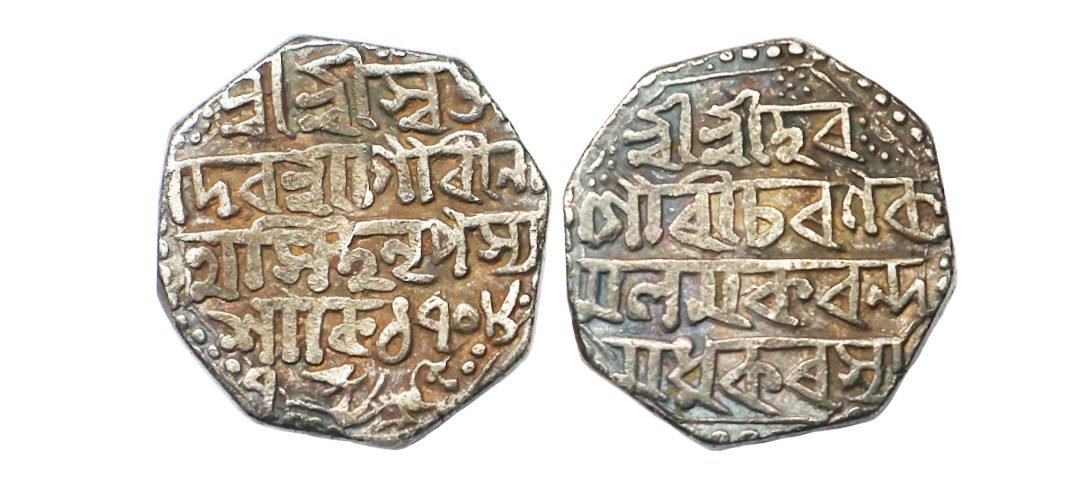 Assam, Gaurinath Simha (SE 1702-1718, 1780-1796 AD), Gold Mohur, SE 1705, Obv. Sri Sri Hara/ Gauri/ Charanara/vinda Makaranda/ Madhukarasya, Rev. Sri Sri Svarga/ Deva Sri Gaurina/tha Simha Nripasya / Sake 1705, lion below, running left, R&B # R3.1, KM #229, Graded by NGC as AU55, very rare.