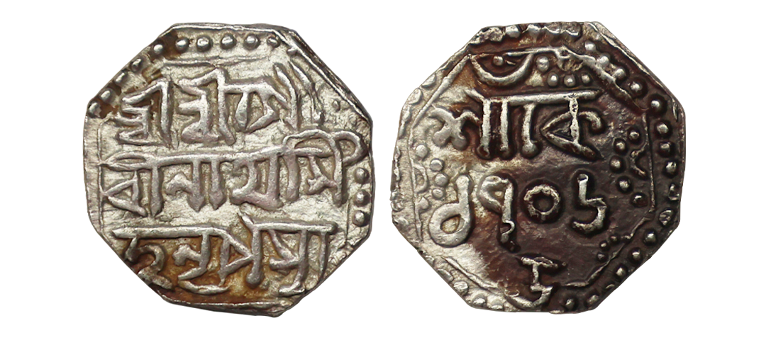 Assam, Gaurinath Simha (SE 1702-1718, 1780-1796 AD), Gold Mohur, SE 1705, Obv. Sri Sri Hara/ Gauri/ Charanara/vinda Makaranda/ Madhukarasya, Rev. Sri Sri Svarga/ Deva Sri Gaurina/tha Simha Nripasya / Sake 1705, lion below, running left, R&B # R3.1, KM #229, Graded by NGC as AU55, very rare.