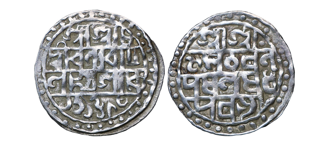 Cooch Behar, Lakshmi Narayan (SE 1509-1549, 1587-1627 AD), Silver Rupee, 10.13 gms, SE 1509, Obv. 'sri sri / siva charana / kamala madhu / karasya' within a square, Rev. 'sri srima / n lakshmi naraya / nasya sake / 1509' all within a square, RB #17, Unique, very fine+, extremely rare. Ex-Nicholas Rhodes’s Collection.