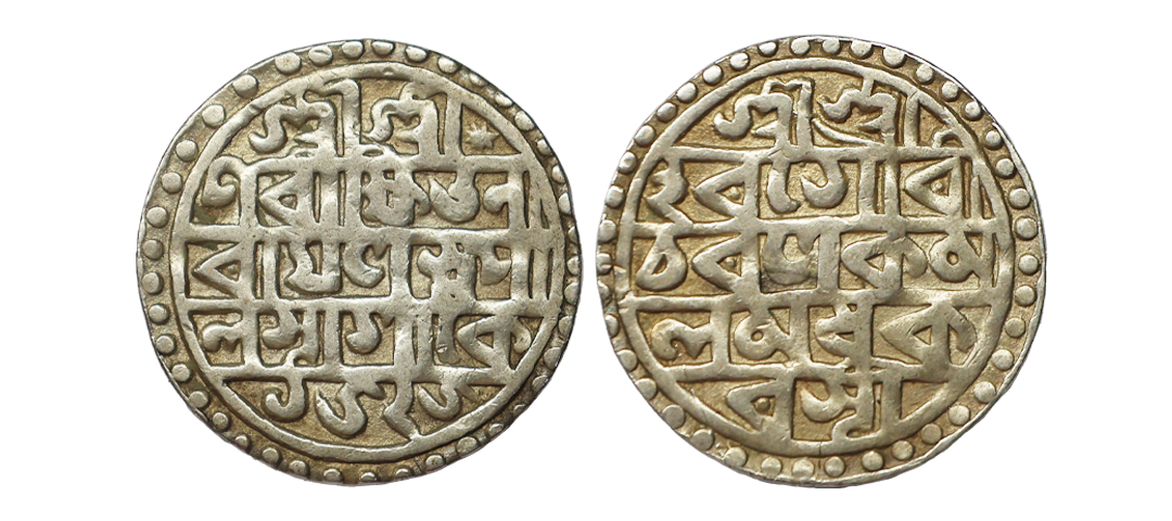Cooch Behar, Lakshmi Narayan (SE 1509-1549, 1587-1627 AD), Silver Rupee, 10.13 gms, SE 1509, Obv. 'sri sri / siva charana / kamala madhu / karasya' within a square, Rev. 'sri srima / n lakshmi naraya / nasya sake / 1509' all within a square, RB #17, Unique, very fine+, extremely rare. Ex-Nicholas Rhodes’s Collection.