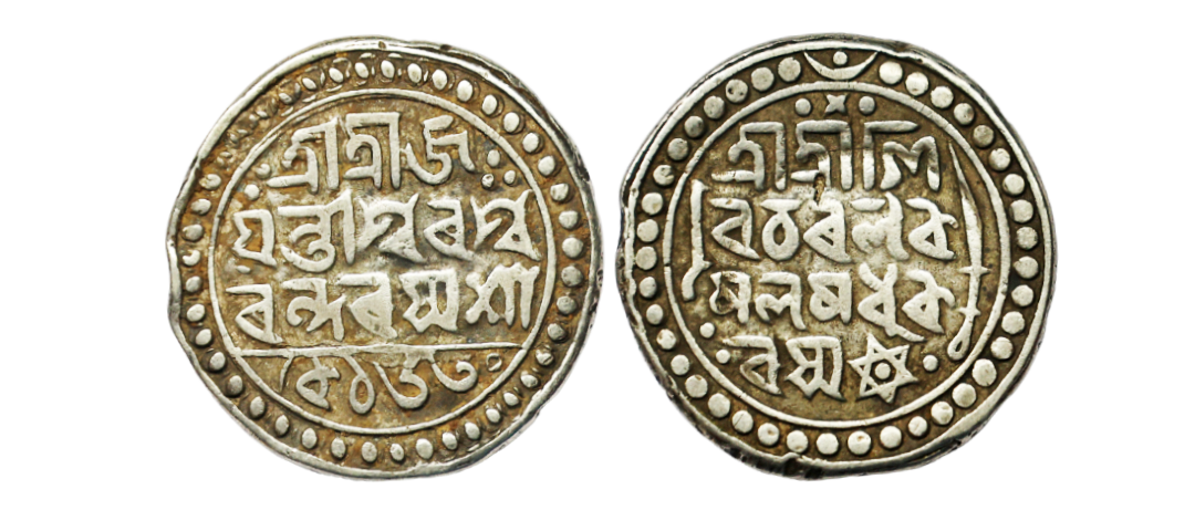 Cooch Behar, Parikshit Narayana (1603-1613 AD), Silver Rupee, SE 1525, Obv. Sri Sri/ Hara Gauri/ Charana kama/la madhu ka/rasya, Rev. Sri Sri/ Parikshit Na/rayana Bhupa/lasya Sake/ 1525, R&B #32, KM #59, less than 10 specimen known till date, extremely fine, exceedingly rare. Note: Parikshit Narayan, the eldest son of Raghudev, succeeded his father as the King of Cooch in 1603. His reign was characterized by a protracted conflict with his cousin, Lakshmi Narayan, the ruler of the Western Cooch kingdom. The conflict escalated when Lakshmi Narayan sought assistance from the Mughal Empire, prompting a Mughal invasion of Parikshit Narayan's realm in 1612. Parikshit Narayan's forces were defeated by the Mughals during the campaign of 1612-1613. Subsequently, his kingdom was annexed, and he was taken prisoner to the Mughal Emperor in Delhi. He passed away in 1616 while undertaking a pilgrimage to Tribeni.