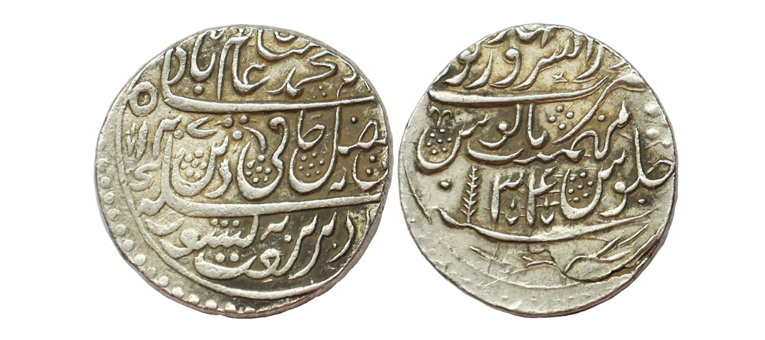 Maratha Confederacy, INO of Shah Alam II, Silver Rupee, 10.76 gms, Mominabad Bindraban Mint (off flan), RY 37, with ‘Shri’ initials on reverse. Obv. sikka zad bar haft kishwar saya-e-fazle elah, hami-e-dine Muhammad Shah Alam Badshah, with the royal umbrella & the flower symbol, Rev. julus maimanat manus RY 37 with Shri Trident & Katar, mint on top, M&W #T1, extremely fine, very rare.