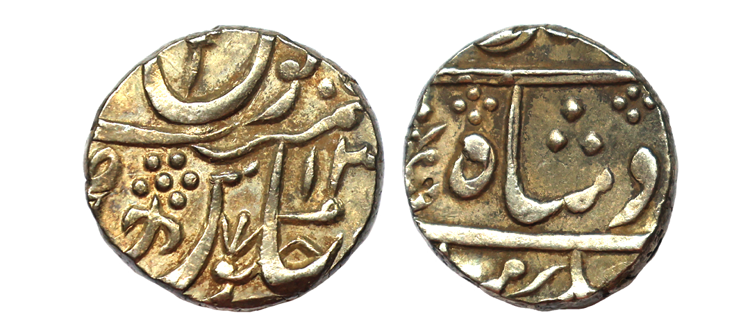 Maratha Confederacy, Jafarabad urf Chandor Mint (by Style) Silver Rupee, 2x RY, In the name of Shah Alam II, Obv: Persian legend "Sikka Mubarak Badshah Ghazi" Rev: Persian legend "sana 2x julus" & "zarb Jafarabad urf Chandor" off flan at the bottom, (KM #260/M&W T1c), superb luster, sharply struck, graded by NGC as MS 63, Rare in this grade.
