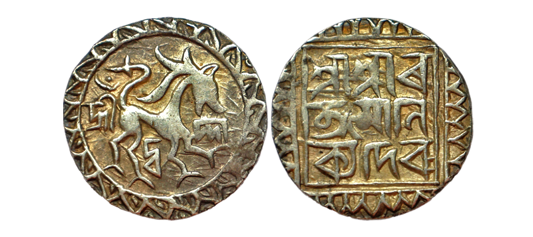 Tripura, Ratna Manikya (1464-1489 AD), Silver Tanka, 10.53 gms, Obv. lion facing right within circle, toothed border around, bengali legend "Sri Du rga" below the lion, Rev. ‘sri sri ra/tna mani/kya deva’ within double square and with toothed ornamental border around, R&B #34, extremely fine, extremely rare.