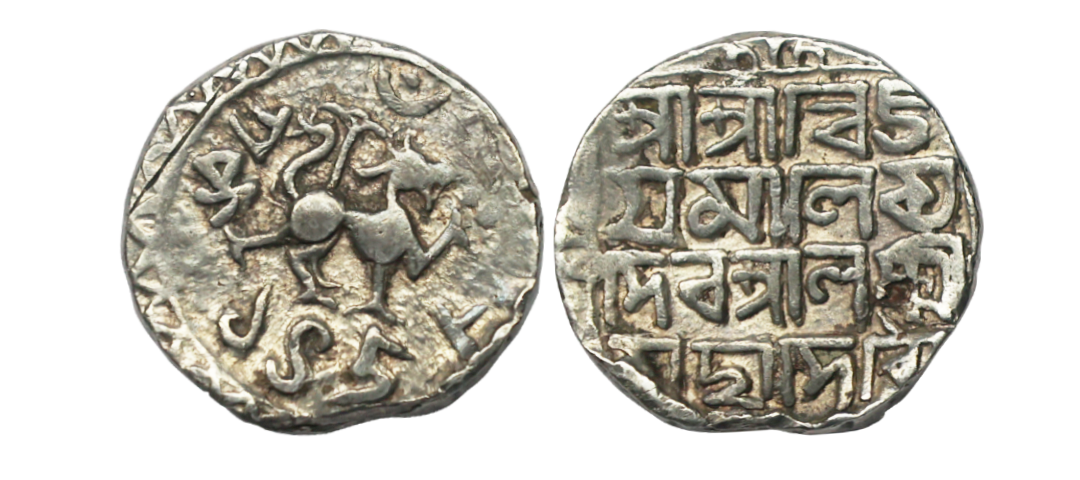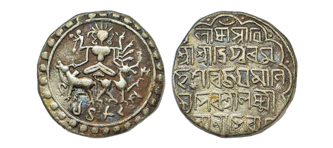 Tripura, Ratna Manikya, citing Queen Lakshmi(1464-1489 AD), Silver Tanka, SE 1389, Obv. Sri Lakshmi/ maha devi/ Sri Sri Ratna/ Manikya, within octagon, Rev. Parvati Pa/ramesvara Cha/rana parah/ 1389, R&B #T6, Graded by NGC as AU55, exceedingly rare. Note: Above Silver Tanka of Ratna Manikya citing Queen Lakshmi is being offered for the very first time in any Indian auction. An exceptional rarity, with only two known specimens recorded till date, making it a pivotal acquisition for dedicated collectors of North East’s Coinage