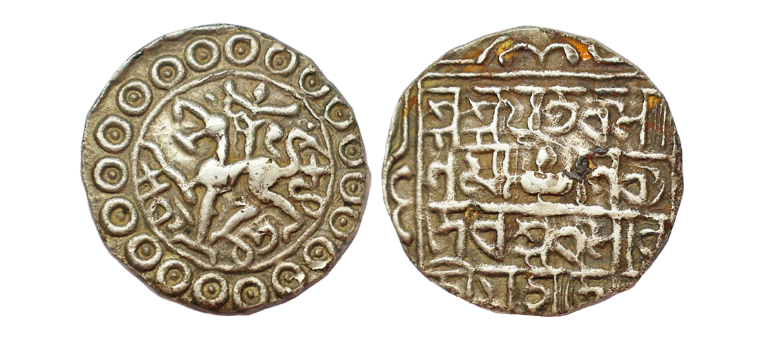 Tripura Kingdom, Vijaya Manikya (SE 1454-1486, 1532-1564 AD), Silver Rupee, 10.42 gms, SE 1458, with citing Queen Lakshmi, Obv. lion facing to right with a date below, crescent and bead above head, Rev. sri sri vija/ya manikya /deva sri lakshmi/maha devyau, R&B # 94, KM #63, very fine, rare.