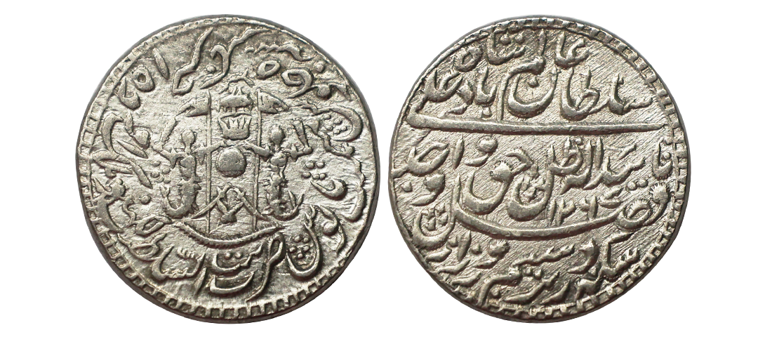 Awadh State, Muhammad Ali Shah (AH 1253-1258, 1837-1842 AD), Silver ¼ Rupee, 2.74 gms, Suba Awadh Bait-us-sultanat Lucknow, AH 1254, Obv. Bajud-o-Karam sikka zad dar Jahan, Muhammad Ali Badshah-e-zaman, Rev. Two attendant standing facing each another holding a crown, curled fish in between, mind name around, extremely fine, struck on a very large flan than usual, extremely rare.