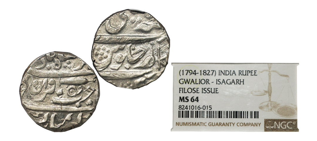 Gwalior State, INO Shah Alam II (AH 1174-1221, 1759-1806 AD), Set of 5 Coins, Silver Rupee, 11.29 gms, Silver ½ Rupee, 5.48 gms, Silver ¼ Rupee, 2.79 gms, Silver 1/8 Rupee, 1.37 gms, Silver 1/16 Rupee, 0.67 gms, Dar-ul-Fateh Ujjain Mint, RY 36, KM # 219, 218, 216, 241, very fine+, rare as a set