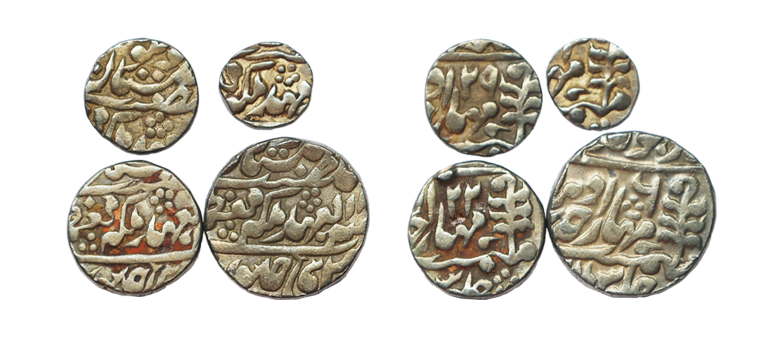 Jaipur State, Madho Singh II (AH 1298-1341, 1880-1922 AD), Set of 4 coins, Silver Rupee, 11.44 gms, RY 6, Silver ½ Rupee, 5.64 gms, RY 22, Silver ¼ Rupee, 2.83 gms, RY 29, Silver 1/8 Rupee, 1.44 gms, Sawai Jaipur Mint, with the name of Victoria, KM # 145, very fine, very scarce as a set.