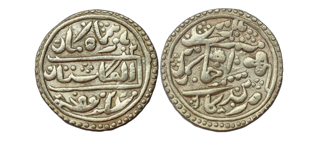 Kashmir State, Ranbir Singh (VS 1914-1942, 1857-1885 AD), Ceremonial Issue, Gold 1/5 Mohur, 2.34 gms, Srinagar Mint, VS 1932, ‘JHS’ type, Obv. Pipal leave in centre & partial legends ‘Sri Raghunath ji Sahai zarb srinagar with initials JHS also visible partially, Rev. Takri legends partially readable ‘Raghanatha Ji Saha Jarava Srinagara with date’, Unlisted Denomination, Graded by PCGS as MS63, extremely rare. Note: This is an extremely rare denomination. While almost a dozen 1/8 Mohur coins surfaced in European auctions since last year, this particular 1/5 Mohur denomination has been offered globally only twice since the last decade. It is a highly sought-after coin in an immaculate grade, exhibiting superb mint luster visible throughout both sides of the coin's field.