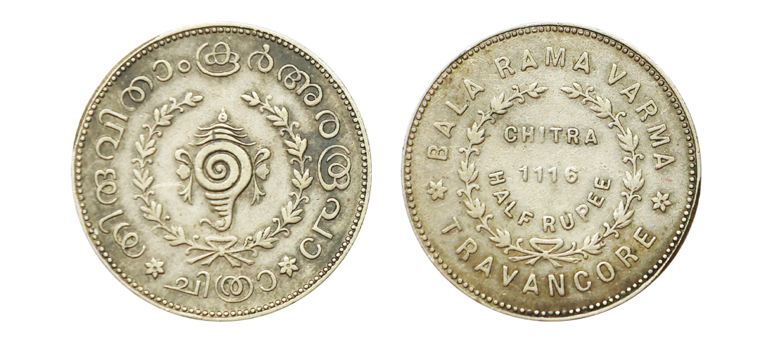 Travancore, Bala Rama Varma II (ME 1101-1126 / 1924-1949 AD), Silver Chitra ½ Rupee, 5.29g, ME 1116, Obv: Ruler’s name with deno. and date, Rev: Conch, milled coinage. (KM # 67). Very Fine+.
