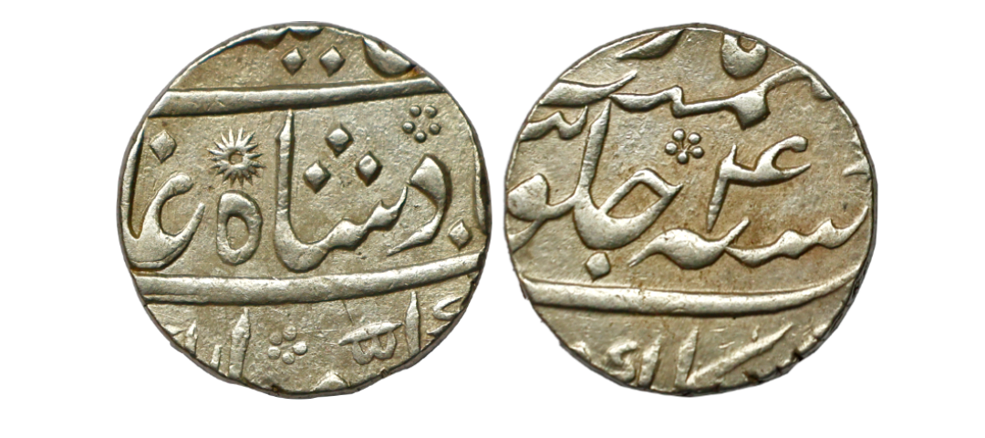 Bengal Presidency, Kalkatta Mint, Silver Rupee, 11.58g, in the name of Alamgir II, RY 4, star symbol on obv. as a mint mark. (P. Stevens # 1.10). Fine. Extremely Rare. Earlier Alamgir II rupees mint name was Alinagar Kalkatta, after the British recaptured the city from the Nawab in January 1757 the mint-name was changed to Kalkatta only.