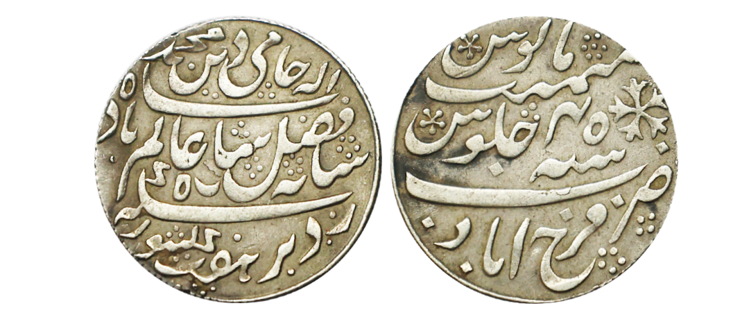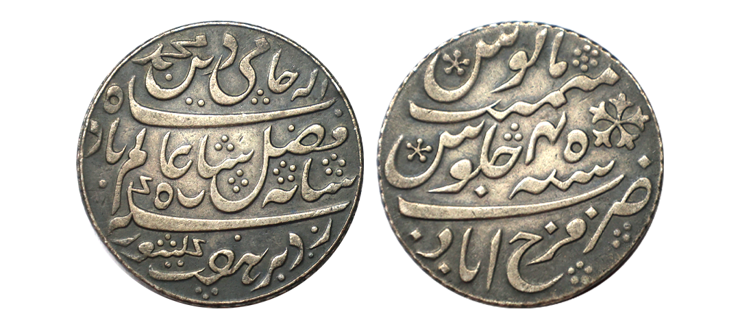 Bengal Presidency, INO Shah Alam II, Silver ½ Rupee, 5.66 gms, Muhammadabad Banaras Mint, RY 17/49, Obv. Sikka zad bar haft kishwar saya-e fazle elah, hami din-e Muhammad Shah Alam Badshah & fish mark, Rev. sana julus maimanat manus 17/49, LM #38, very fine+, rare.