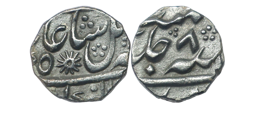 Bengal Presidency, INO Shah Alam II (AH 1174-1221, 1759-1806 AD), Silver 1/16 Rupee, 0.70gms, Murshidabad Mint, RY 7, ‘saya-e-fazle elah’ couplet, About Extremely fine, very rare.