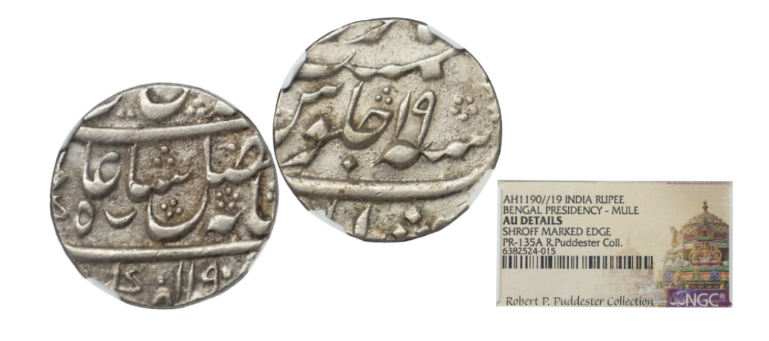 Bengal Presidency, INO Shah Alam II (AH 1174-1221, 1759-1806 AD), Silver ¼ Rupee, 2.91 gms, Murshidabad Mint, RY 12, ‘Saya-e-fazle elah’ couplet, KM #82.2, Pr #124, very fine, very rare.
