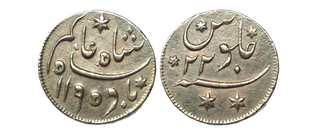 Bengal Presidency, in the name of Shah Alam II (AH 1174-1221, 1759-1806 AD), Copper 1/4 Anna, '3' o Clock Rotated die, 6.52gms, Princep Issue, Fulta Mint, AH 1195, RY 22, Obv: Persian legend 'Shah Alam Badshah'& Hijri year 1195, Rev: Persian legend "sana 22 julus", very fine+, very scarce.