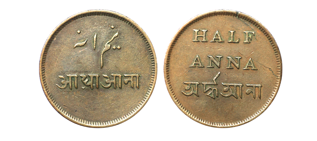 Bengal Presidency, in the name of Shah Alam II (AH 1174-1221, 1759-1806 AD), Copper 1/8 Anna, 3.68 gms, Princep Issue, Fulta Mint, AH 1195, RY 22, Obv: Persian legend 'Shah Alam Badshah'& Hijri year 1195, Rev: Persian legend "sana 22 julus", very fine+, very scarce.