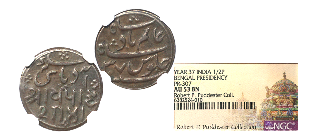 Bengal Presidency, in the name of Shah Alam II (AH 1174-1221, 1759-1806 AD), Copper 1/8 Anna, 3.68 gms, Princep Issue, Fulta Mint, AH 1195, RY 22, Obv: Persian legend 'Shah Alam Badshah'& Hijri year 1195, Rev: Persian legend "sana 22 julus", very fine+, very scarce.
