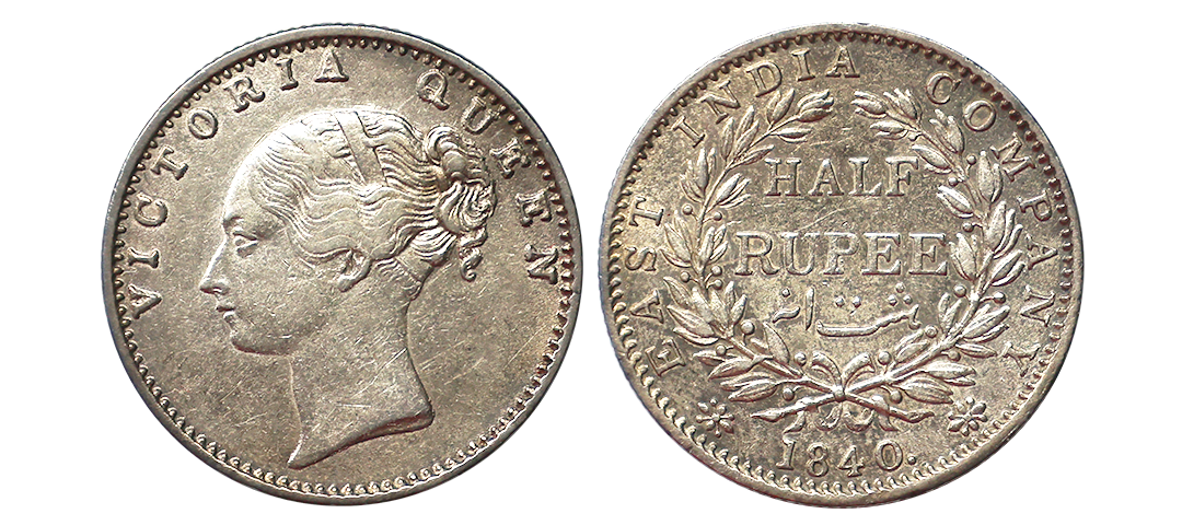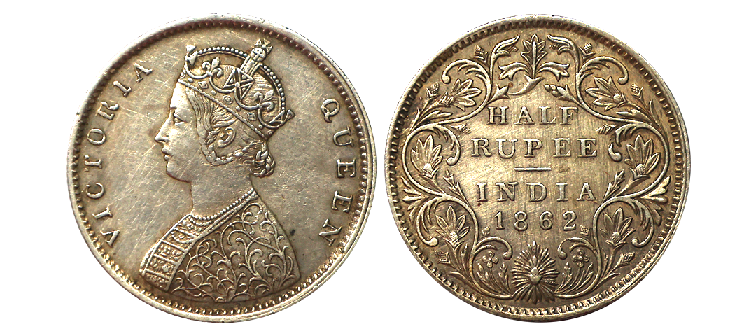 Victoria Queen, Silver Rupee, 1862, Mule Rupee, Obverse of Copper half anna paired with rupee reverse, exceedingly rare variety, Graded and slabbed by NGC as AU53, one of the finest specimens known of this type, missing from major collections. exceedingly rare.