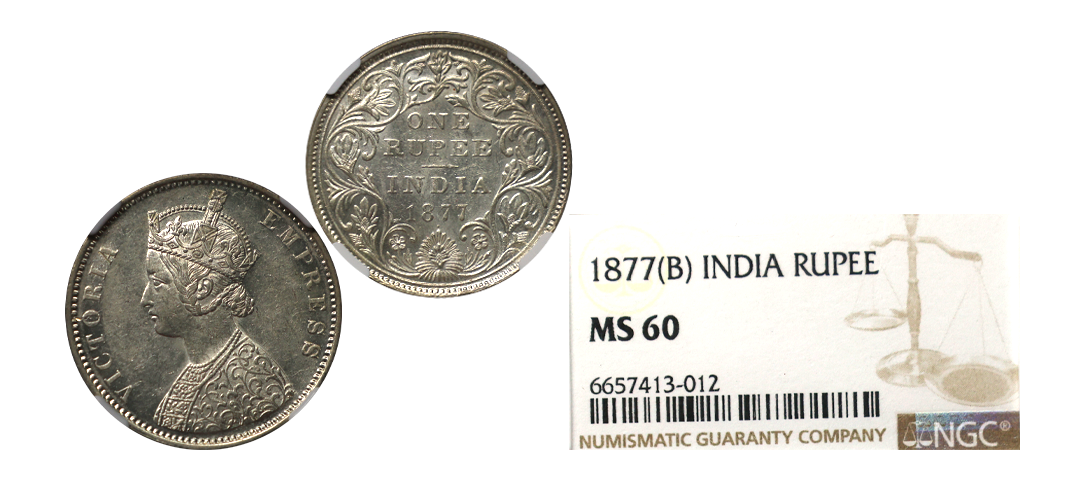 Victoria Empress, Silver Rupee, 1877, Bombay Mint Dot, Obv: A2/Rev: II, Scarce, Graded by NGC MS60.
