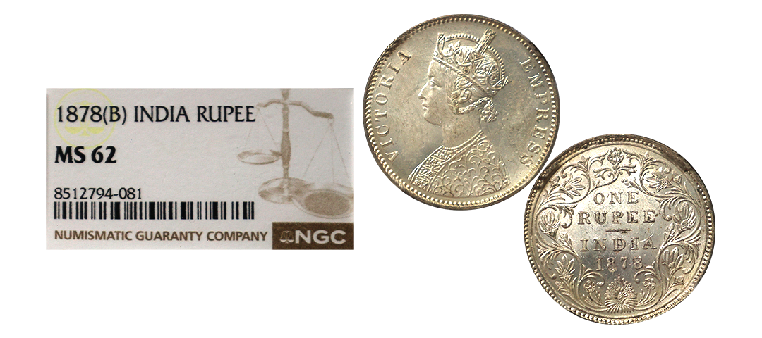 Victoria Empress, Silver Rupee, 1878, A3/II(i), dot, Excellent Surfaces with Superb luster, graded by NGC as MS62, Very Rare.