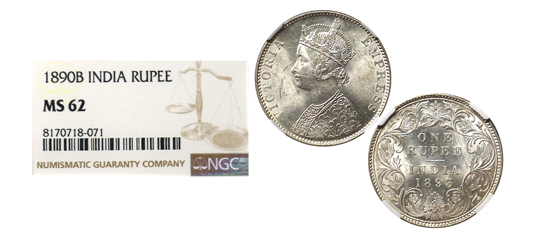 Victoria Empress, Silver Rupee 1890, C2/I, B incuse at Top, graded by NGC as MS62, Very Rare.