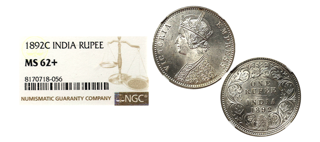 Victoria Empress, Silver Rupee, 1892, Calcutta Mint, C3/I, c Incuse, the coin is in it's natural state, with excellent mint bloom and has superb eye appeal, Graded by NGC as MS 62+, Extremely Rare.