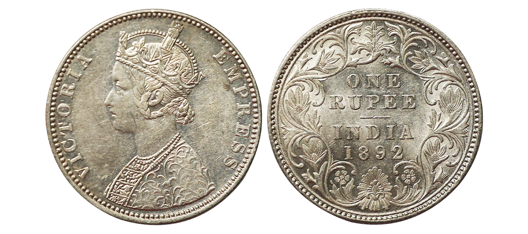 Victoria Empress, Silver Rupee,1892, C2/I(ii), B raised on top flower, about uncirculated, rare variety in tough grade.
