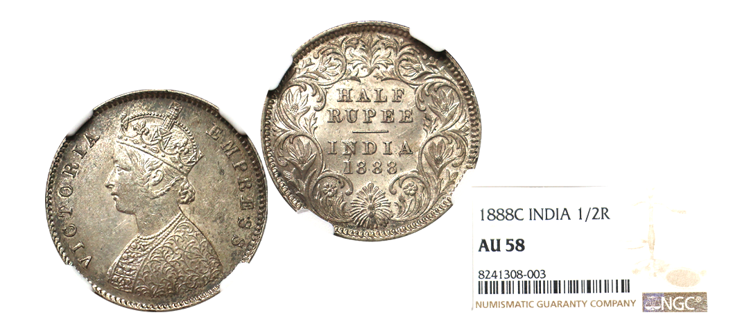 Victoria Empress, Silver 1/2 Rupee, 1888, Calcutta Mint, NGC Graded as AU58, rare.