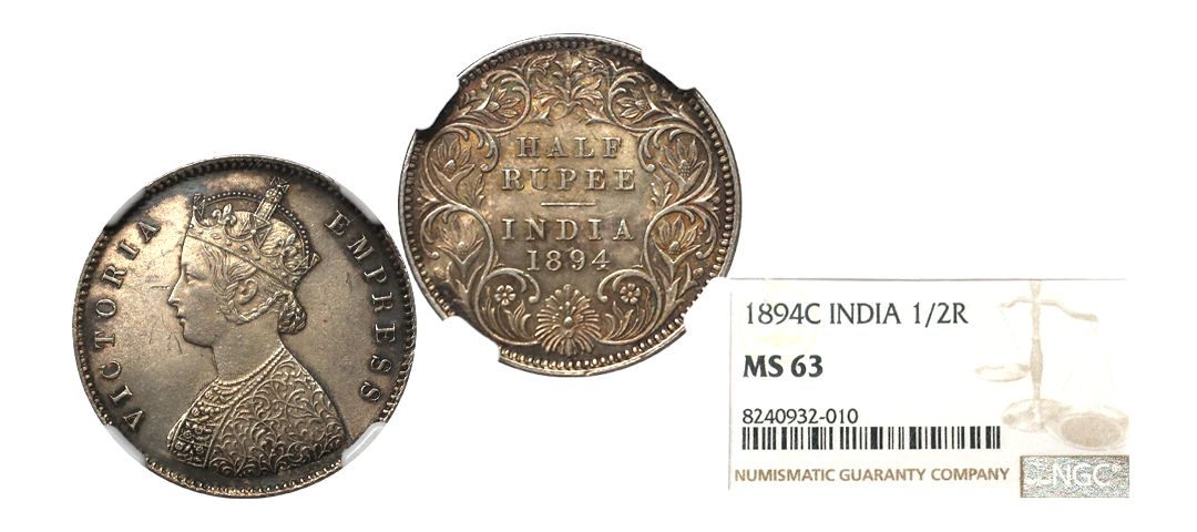 Victoria Empress, Silver 1/2 Rupee, 1894, Calcutta Mint, NGC Graded as MS63, Extremely rare.