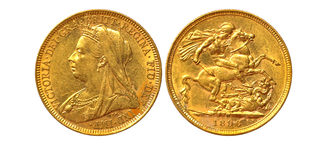 British Colony, Australia, Victoria Empress, Gold Sovereign, 7.98 gms, 1896 AD, Melbourne Mint, Obv. Older crowned and veiled of Queen Victoria to left legends ‘VICTORIA·DEI·GRA·BRITT·REGINA·FID·DEF · IND·IMP· T.B.’ around, Rev. St George slaying the dragon, with the date in exergue below 1896, KM #13, uncirculated, scarce.