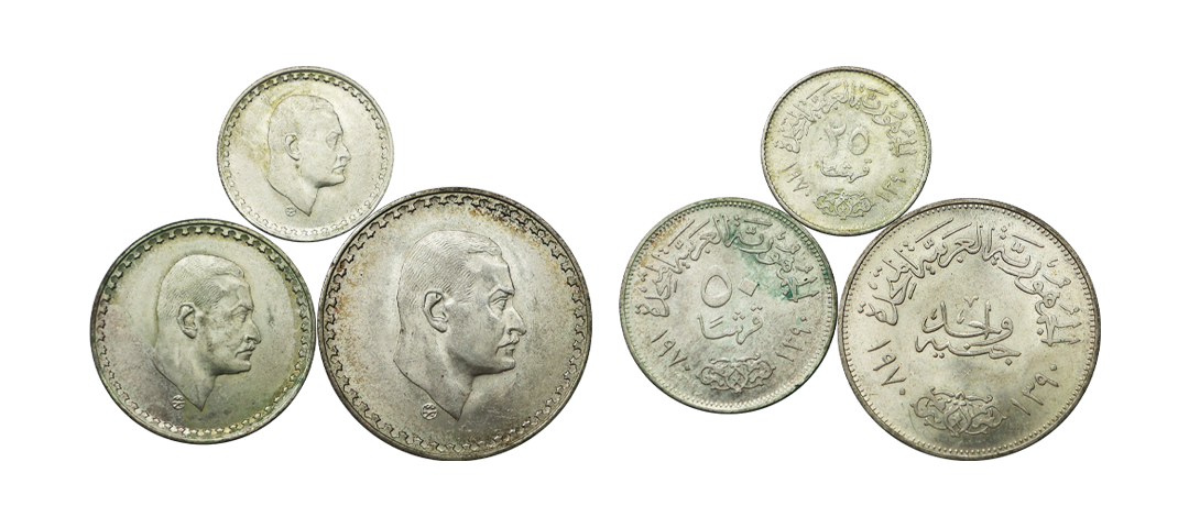 Egypt, A set of Silver 1 Pound, 50 & 25 Fils (3), AD 1970, commemorative issue of President Nasser of Egypt, President portrait to right on obv.