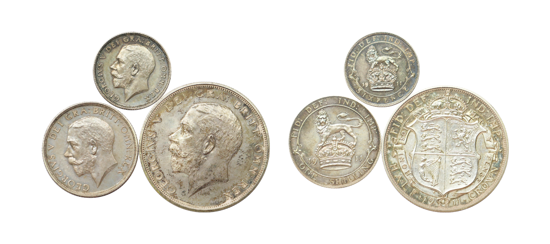 Great Britain, Silver 1 Shilling, 6 Pence and Half Crown, AD 1911 & 1902, with name of George VI, Obv: Portrait of George VI, Rev: Country’s monogram. Very Fine+ to Extremely Fine.