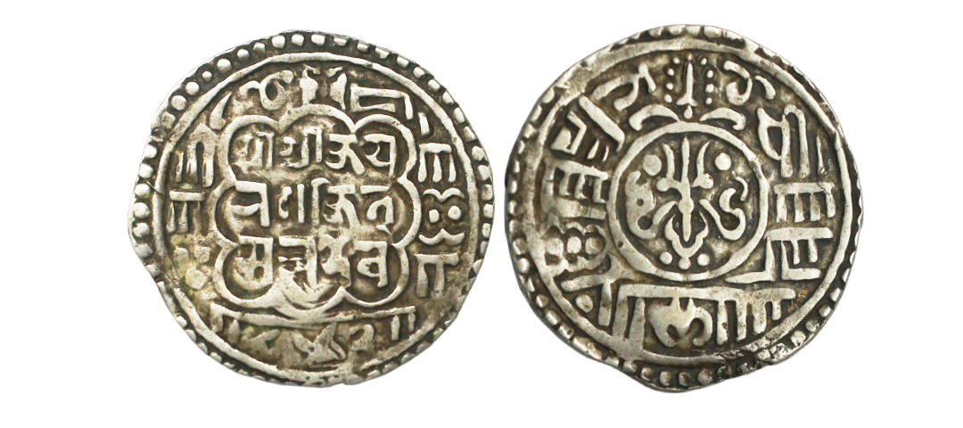 Nepal-Bhaktapur Kingdom, Malla dynasty, Jaya Ranjitmalla (1722-1769 AD), Silver Mohur, 5.31 gms, SE 842 (1722), Obv. Devanagari legend in center within circle, date below. Rev. Trident symbol with above two dots inner circle, around legend, KM # 108, very fine, very scarce.