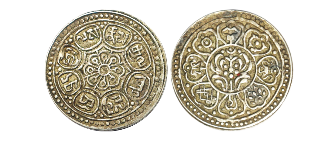 Tibet, Ganden Phodrang (1642-1959 AD), Silver 1 Tangka "Ga-den Tangka", 4.25 gms, Obv. Eight-spoked wheel surrounded by Tibetan characters within the petals of an eight-petalled lotus, Rev. Ornate lotus design surrounded by the Buddhist Eight Auspicious symbols, Y #13, very fine, very scarce.