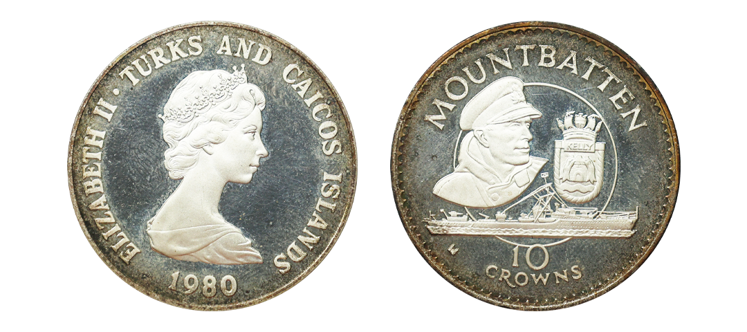 Turks and Caicos Islands, Silver 10 Crowns, AD 1930, Commemorative issue, 1st Anniversary of the death of Lord Mountbatten, Elizabeth portrait on obv. (KM # P2). Extremely Fine+.
