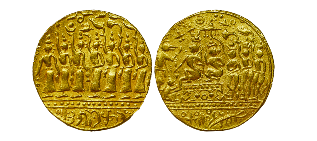 Ram Darbar Temple Token, Gold, 12.20 gms, Depiction of Ram Darbar, Lord Ram seated with Goddess Sita on the couch attendants on right holding Chattri & flywhisk Lord Hanuman on left, Rev. 7 male figures to left, extremely fine, rare.
