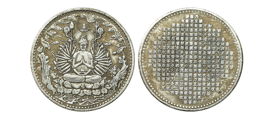 China, Bodhisattva Amulet, Silver, 37.49g, Obv: Multi-armed deity seated on lotus probably Bodhisattva Avalokiteshvara, holding numerous arms and implements, Rev: Chinese text as a Buddhist scripture specifically the heart sutra. Very Fine+.