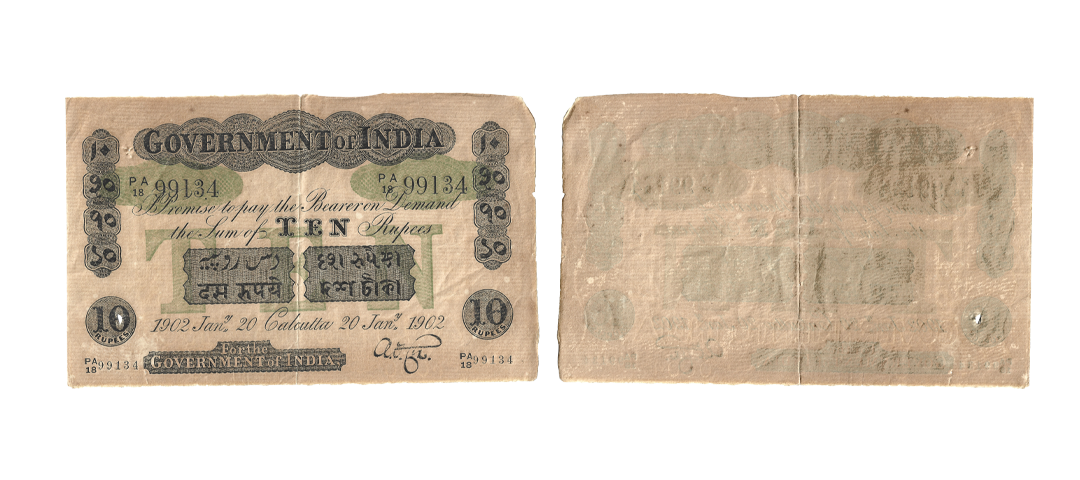 British India, King Edward VII, Uniface 10 Rupees, Calcutta Circle, Dated 20 January 1902, Signed by A.F. Cox, Green Underprint, PA Prefix, S. No. PA18 99134, (KJ & RR # 2A.2.1A.9), holes, folds, stains, splits, tears, Very Fine, Extremely Rare.
