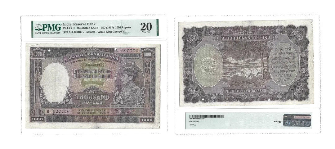 British India, 1938, King George VI, 1000 Rupees, Karachi Circle, Signed by J.B. Taylor, A Prefix, S. No. A4 135871, (KJ & RR # 4.8.1D), staple holes at issue, repairs, joined, graded by PMG as 25 NET Very Fine, Extremely Rare. The Karachi circle is the rarest for this denomination in this King George VI series.