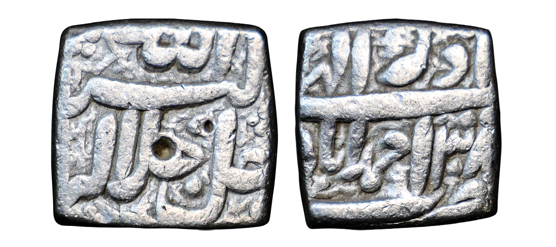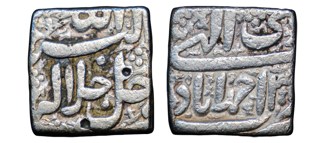 Akbar, (1556-1605 AD), Silver Square Rupee, 11.28g, Ahmedabad Mint, AH 999, Kalima type, (KM 82.1). Very Fine+.