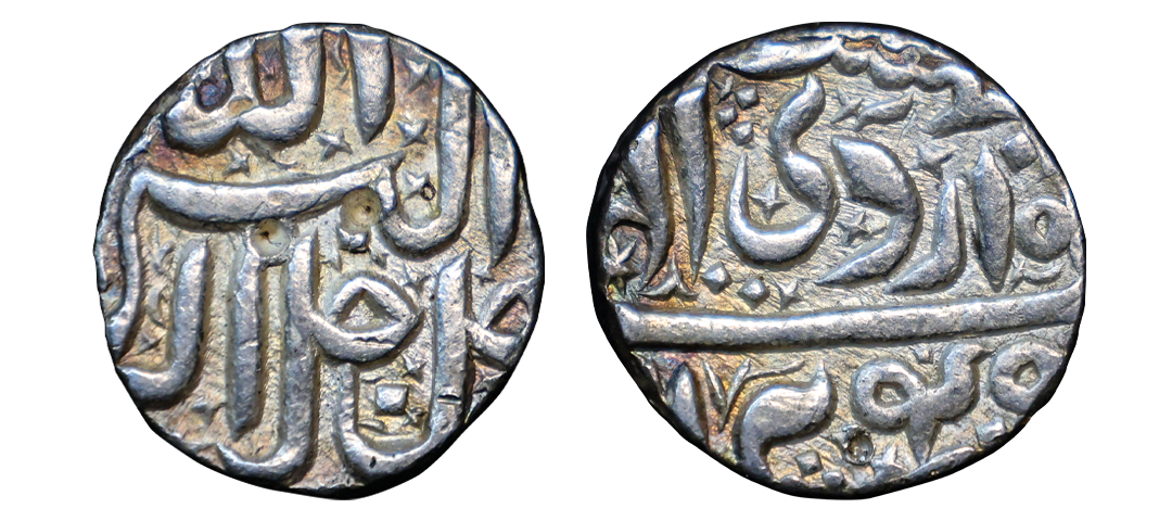 Akbar (AH 963-1014, 1556-1605 AD), Silver Rupee, 11.43 gms, Berar Mint, a bird below the mint name, Ilahi Month Aban, Year 4x, KM # 93.6, extremely fine, very scarce.