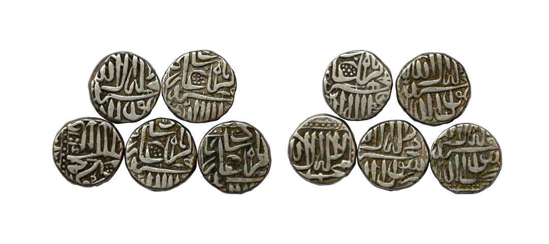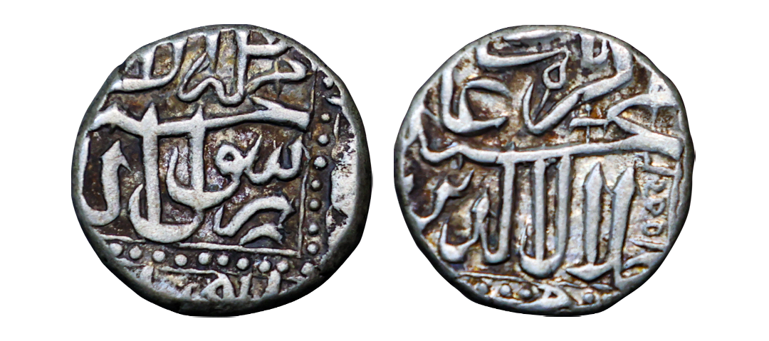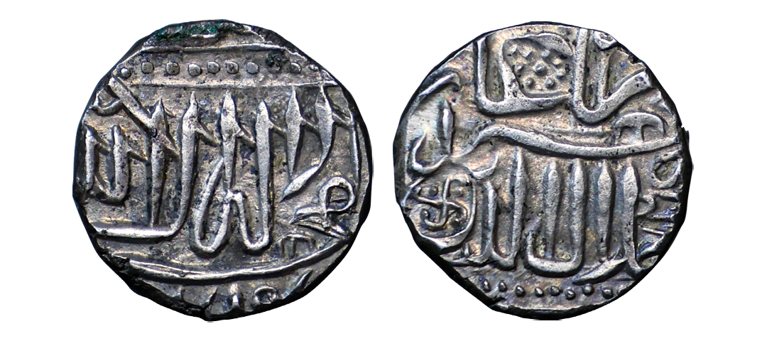 Akbar (AH 963-1014/1556-1605 AD), Mulhar Mint, Silver ½ Rupee (Mahmudi), Baglana issue, Obv: Arabic legend The Kalima Shahada, Rev: Persian legend "Jalal-ud-din Muhammad Akbar Badshah Ghazi", spear mark, (KM# 72.1), graded by NGC as MS63, Rare in this grade.