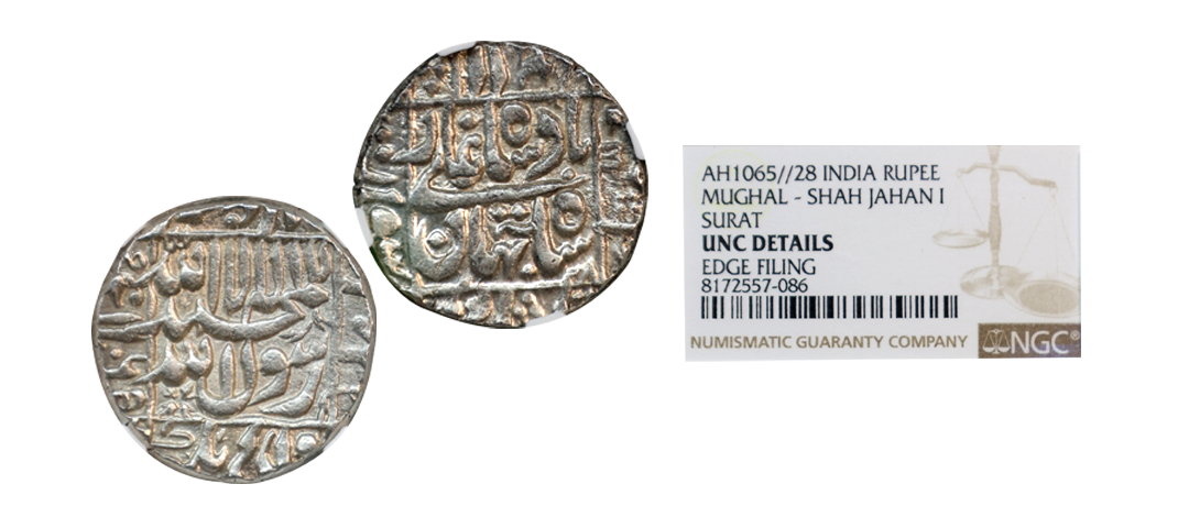 Shah Jahan (AH 1037-1068, 1628-1658 AD), Silver Rupee, 11.35 gms, Surat Mint, KM # 235.23, very fine, scarce.