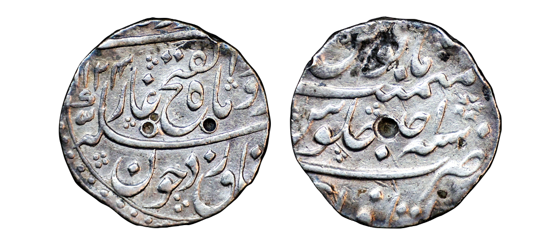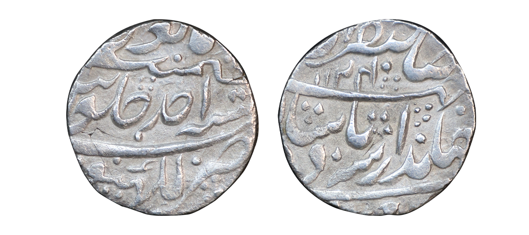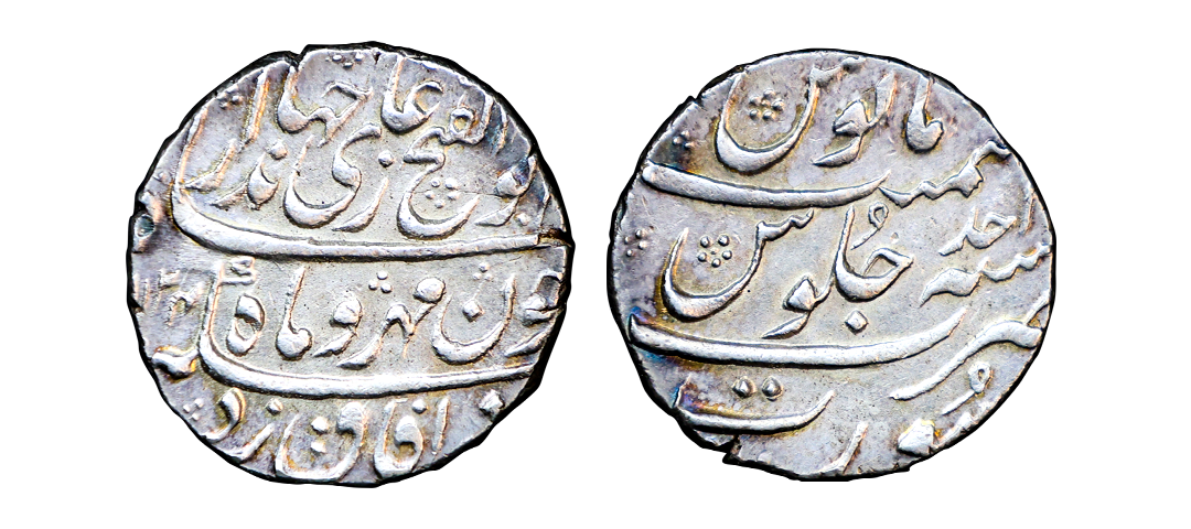 Jahandar Shah (AH 1124/1712-1713 AD), Bareli Mint, Silver Rupee, AH 1124/Ahad RY, "Saheb Qiran" Couplet, Obv: Persian legend "ba zad sikka bar meh, chu saheb qiran Jahandar Shah, Badshah-e Jahan" & 1124 Hijri, Rev: Persian legend "sana Ahad julus" & "zarb Bareli", (KM # 364.7), superb luster, struck in high relief, centrally struck, immaculate sheen, graded by NGC as MS 63, Very Rare in this grade.
