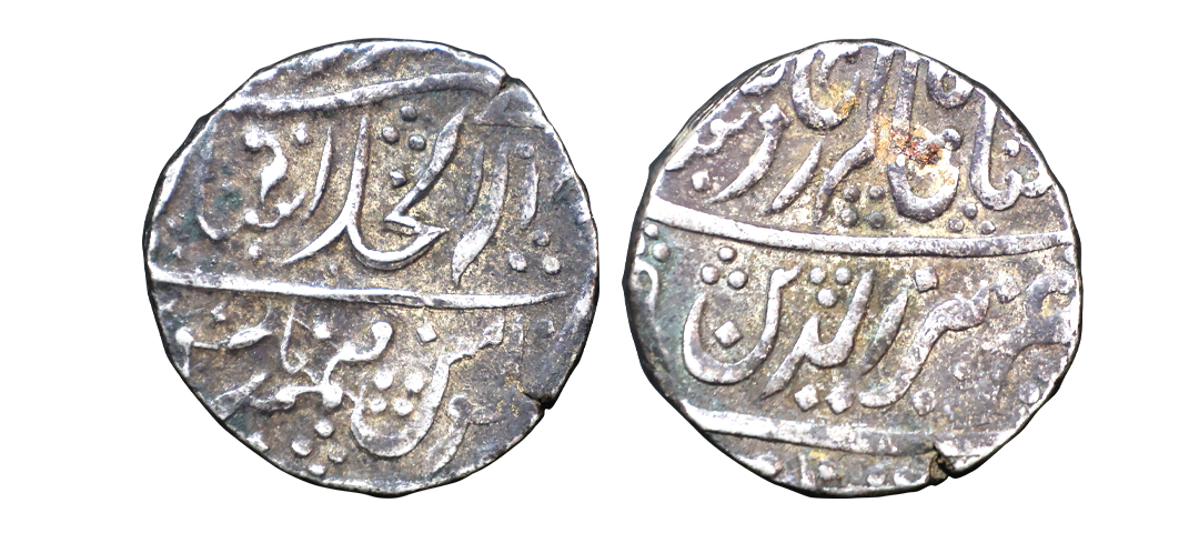 Jaintiapur, Jatra Narayan (SE 1704-1707/1782-1785 AD) Silver Tanka/Rupee, Saka Era 1704, Obv: legends "sri sri si/va charana ka/mala madhu ka/rasya" and a six-pointed star, two beads in the lower field,within a double circled border with beads in between, Rev: legends, "sri sri ja/yantipura pu/randarasya" & SE 1704, flowers at the left and right of the top line, with petals of elongated dots, within a double circled border with beads in between, Graded by NGC as VF 35, KM # 192/RB # M1, very rare.
