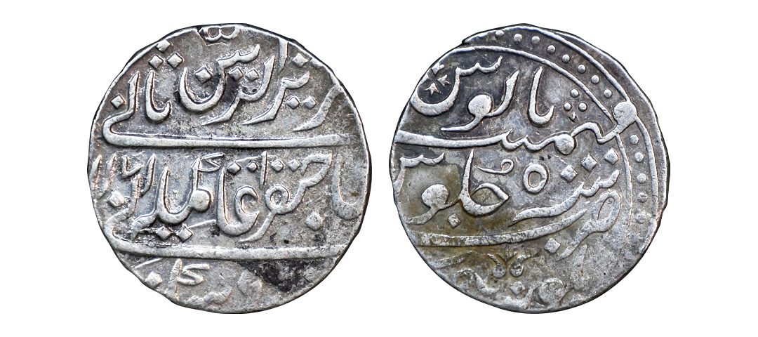 Jaintiapur, Jatra Narayan (SE 1704-1707/1782-1785 AD) Silver Tanka/Rupee, Saka Era 1704, Obv: legends "sri sri si/va charana ka/mala madhu ka/rasya" and a six-pointed star, two beads in the lower field,within a double circled border with beads in between, Rev: legends, "sri sri ja/yantipura pu/randarasya" & SE 1704, flowers at the left and right of the top line, with petals of elongated dots, within a double circled border with beads in between, Graded by NGC as VF 35, KM # 192/RB # M1, very rare.