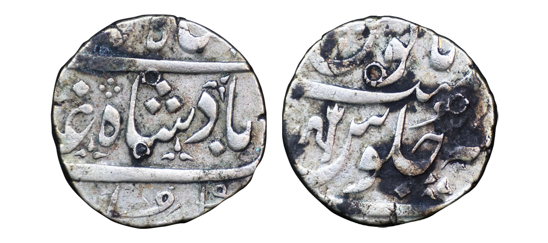 Maratha Confideracy, INO Alamgir II (AH 1167-1173, 1755-1761 AD), Silver Rupee, 11.20 gms, Bagalkot Mint (pseudo mint name Dar ul-Khilafa Shahjahanabad), KM # 228, about very fine, very scarce.