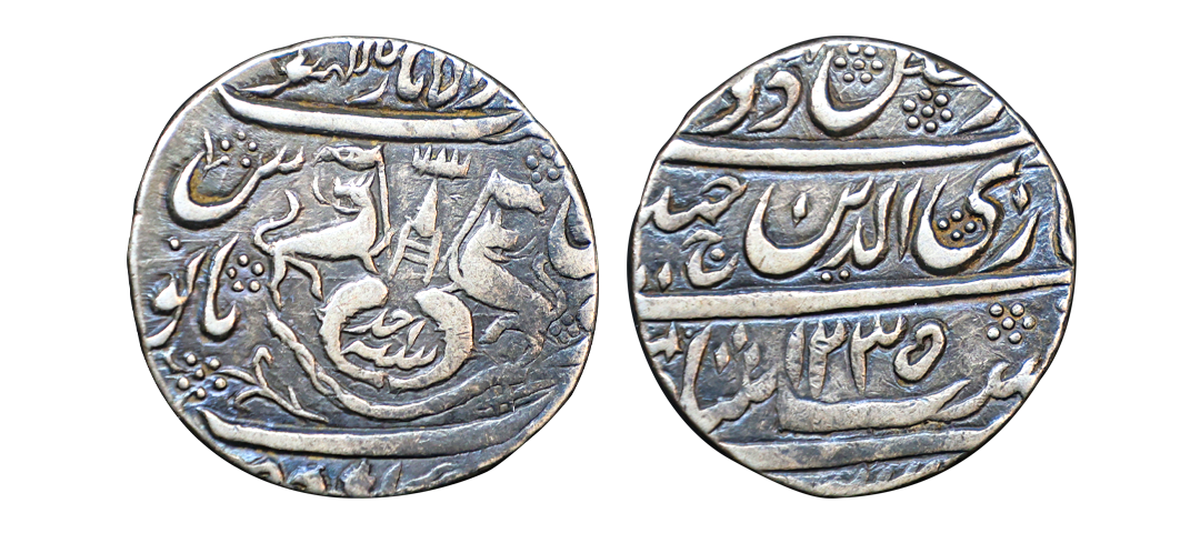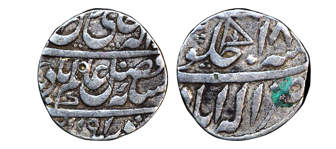 Awadh State, INO Shah Alam II, Silver Rupee, 11.30 gms, Muhammadabad Banaras Mint, double bannered Flag on obverse, RY 4, very fine+, very scarce.