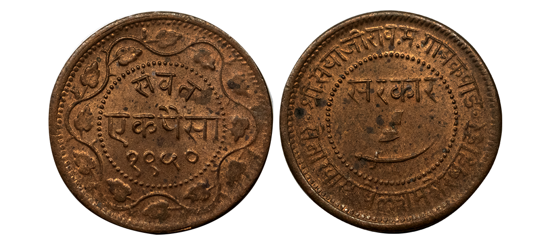 Baroda State, Sayaji Rao III (VS 1932-1995, 1875-1938 AD), Copper Paisa, 2.29 gms, VS 1950, KM #Y32.2a, very fine, scarce